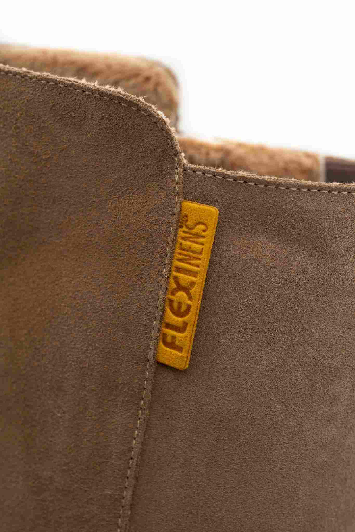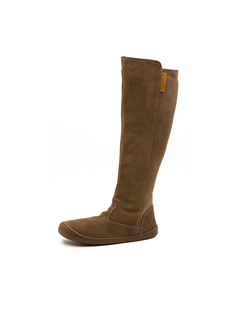 Botas altas barefoot de serraje marrón. Su suela fina y plana (zero drop) permite un movimiento natural del pie, con puntera ancha para evitar presiones. Interior forrado en borreguillo sintético que mantiene el calor. Adecuadas para pies medios o ligeramente anchos, con empeines bajos o medios.