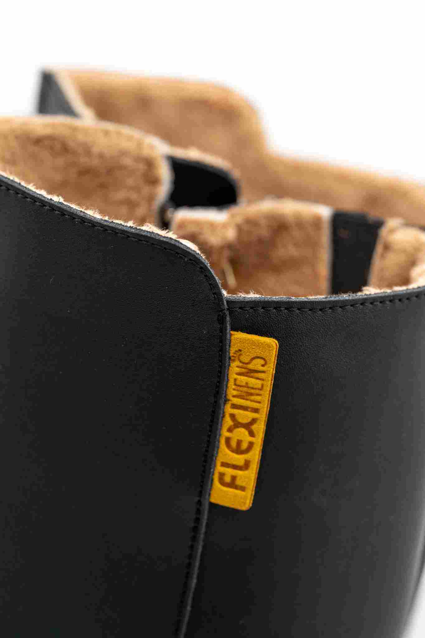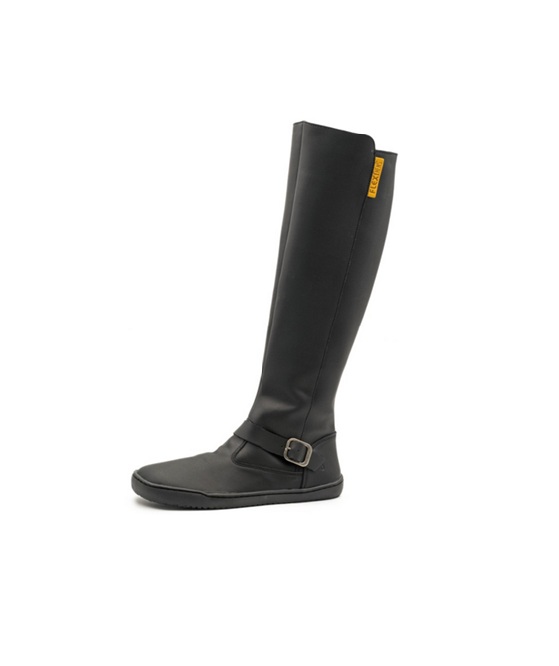 Botas altas barefoot para mujer en piel negra, con forro cálido interior y suela ultraflexible de 4 mm. Diseñadas con puntera ancha y zero drop, aportan confort térmico y libertad de movimiento en invierno.