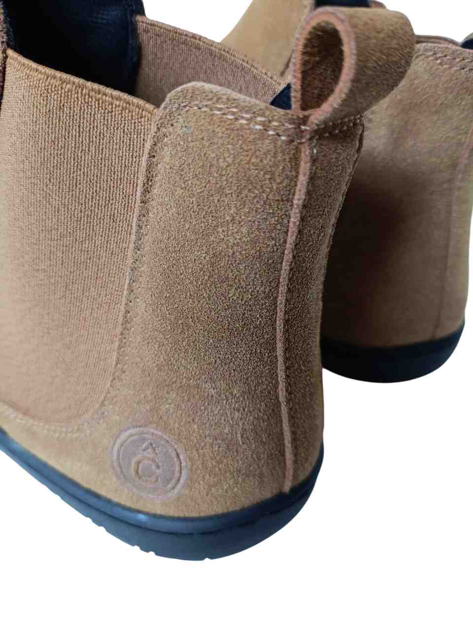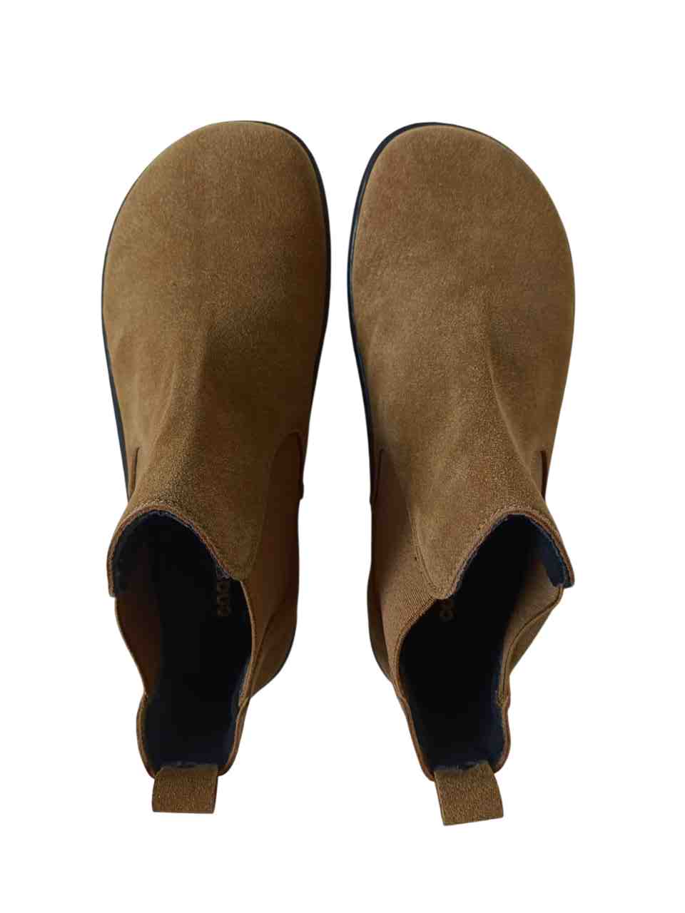 Botines barefoot Chelsea 4368 camel para mujer Coqueflex, fabricados en microfibra vegana resistente. Puntera ancha, suela plana y elásticos tipo Chelsea para un ajuste cómodo y minimalista. Se ajusta a pies estrechos y medios, y varios tipos de empeine.