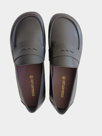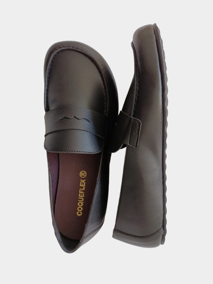 Mocasín barefoot Coqueflex 4395 para mujer, en piel vegana negra. Suela fina y flexible (drop 0), puntera ancha, sin contrafuerte y plantilla extraíble. Diseñado para pies medios o estrechos y empeines medios-bajos.