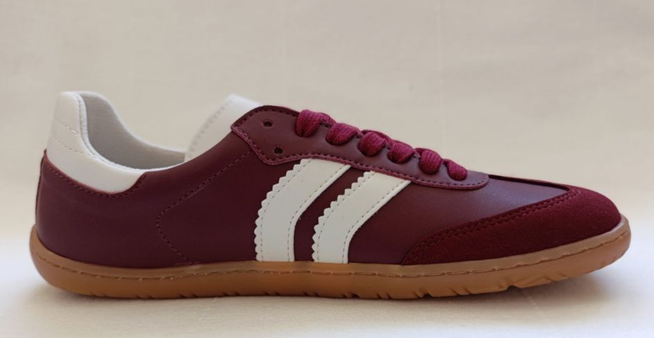 Zapatilla Coqueflex estilo samba en color borgoña, barefoot unisex. Suela zero drop de 4 mm, horma anatómica y materiales veganos. Ideal para pies estrechos o medios.