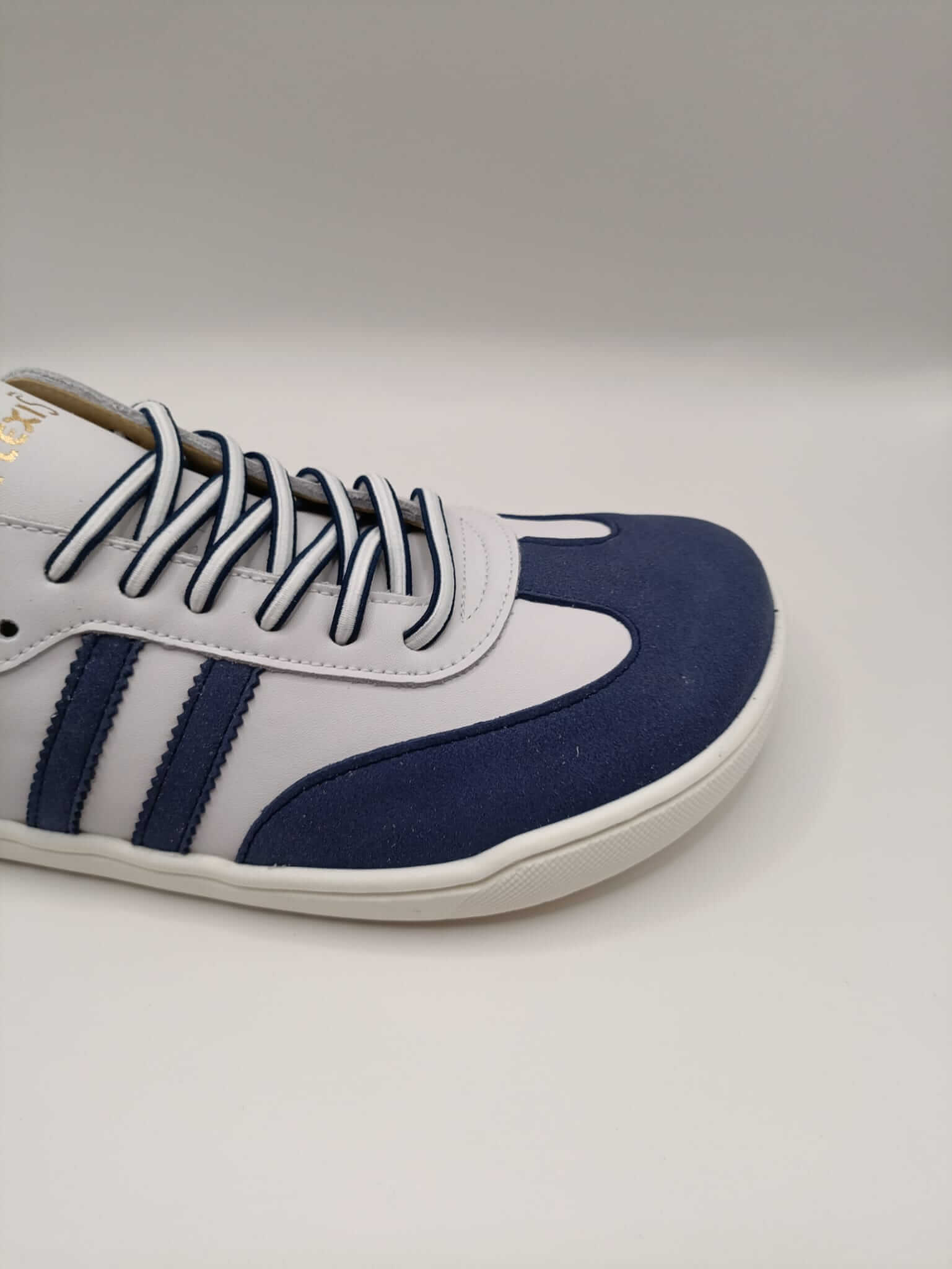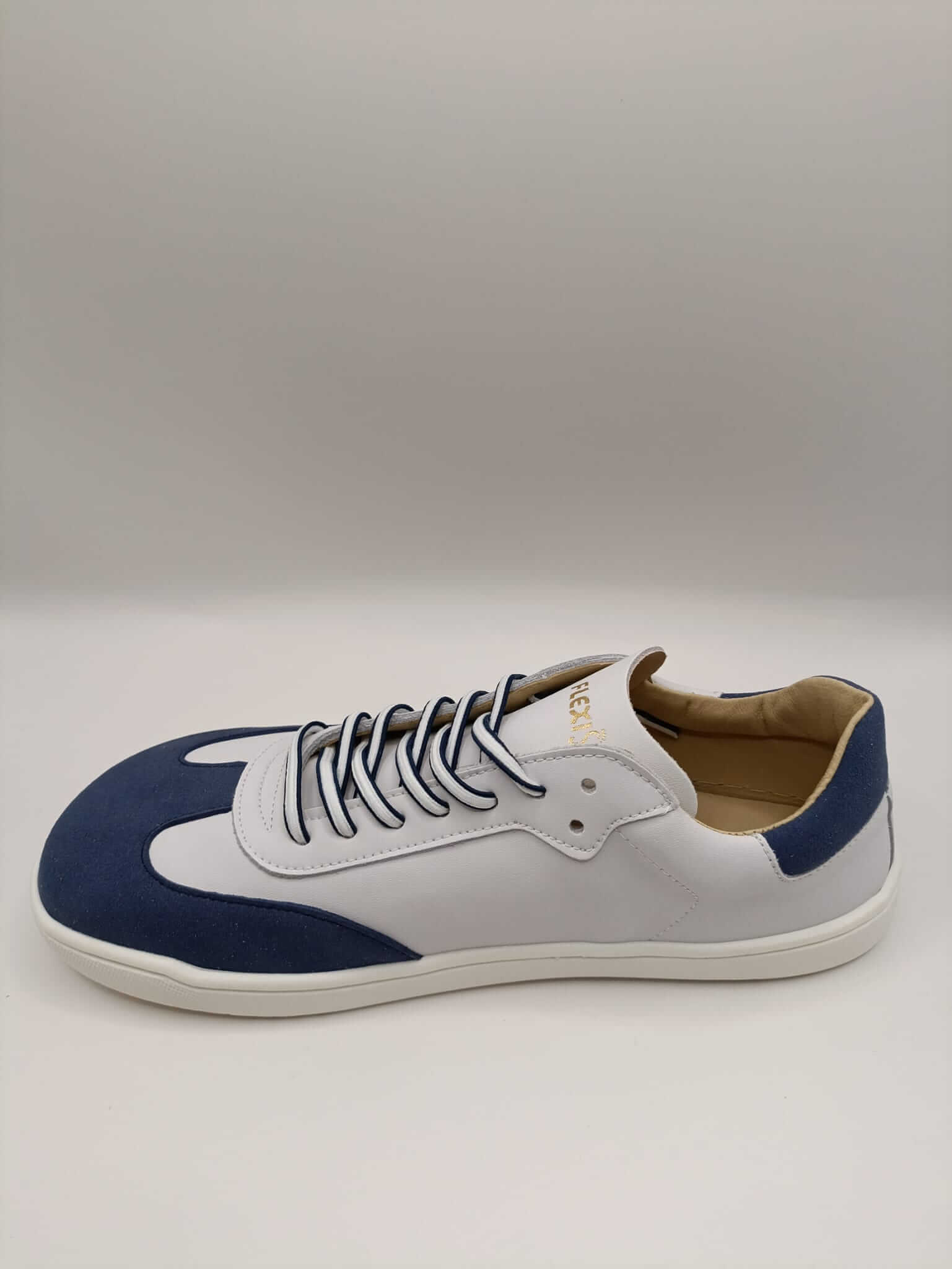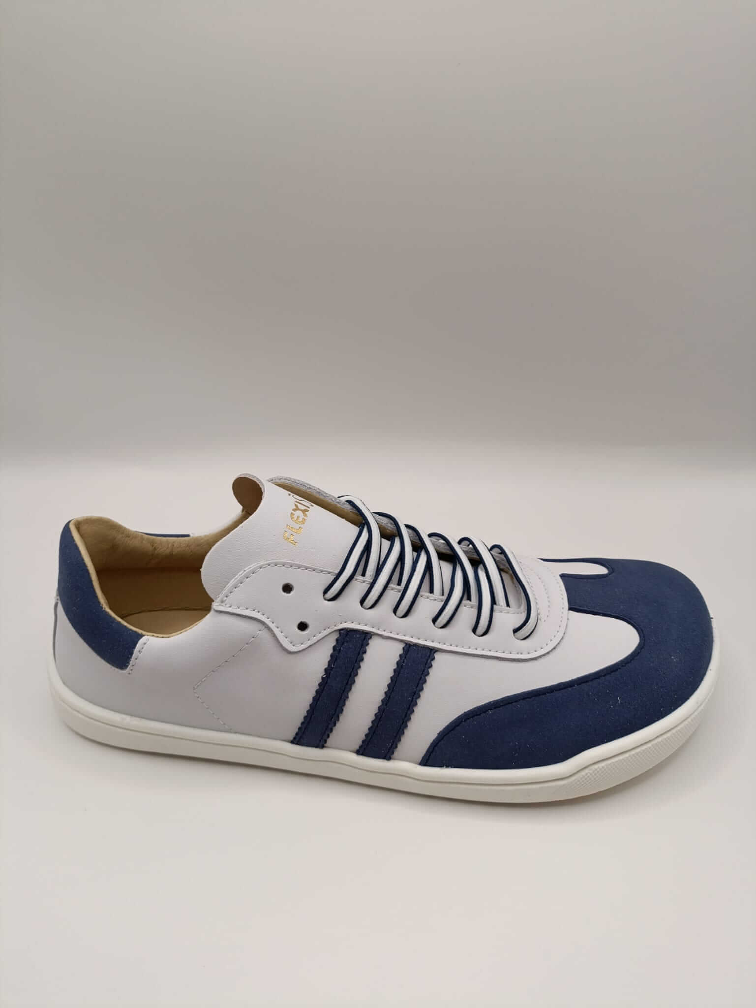 Zapatillas barefoot hombre Flexi Nens 9028-XL en piel natural navy/blanco, con suela flexible y zero drop para una pisada natural. Ajuste con cordones elásticos. Tallas 41-45.