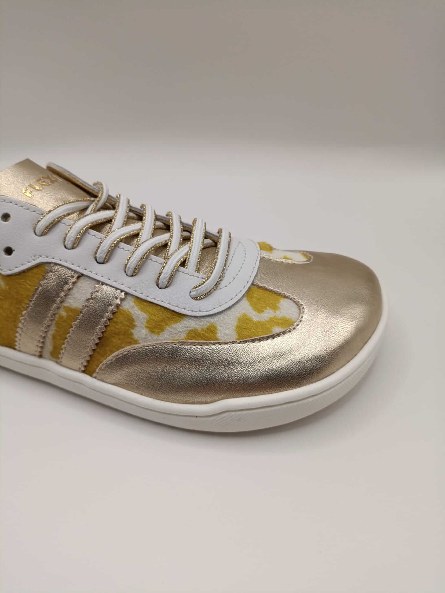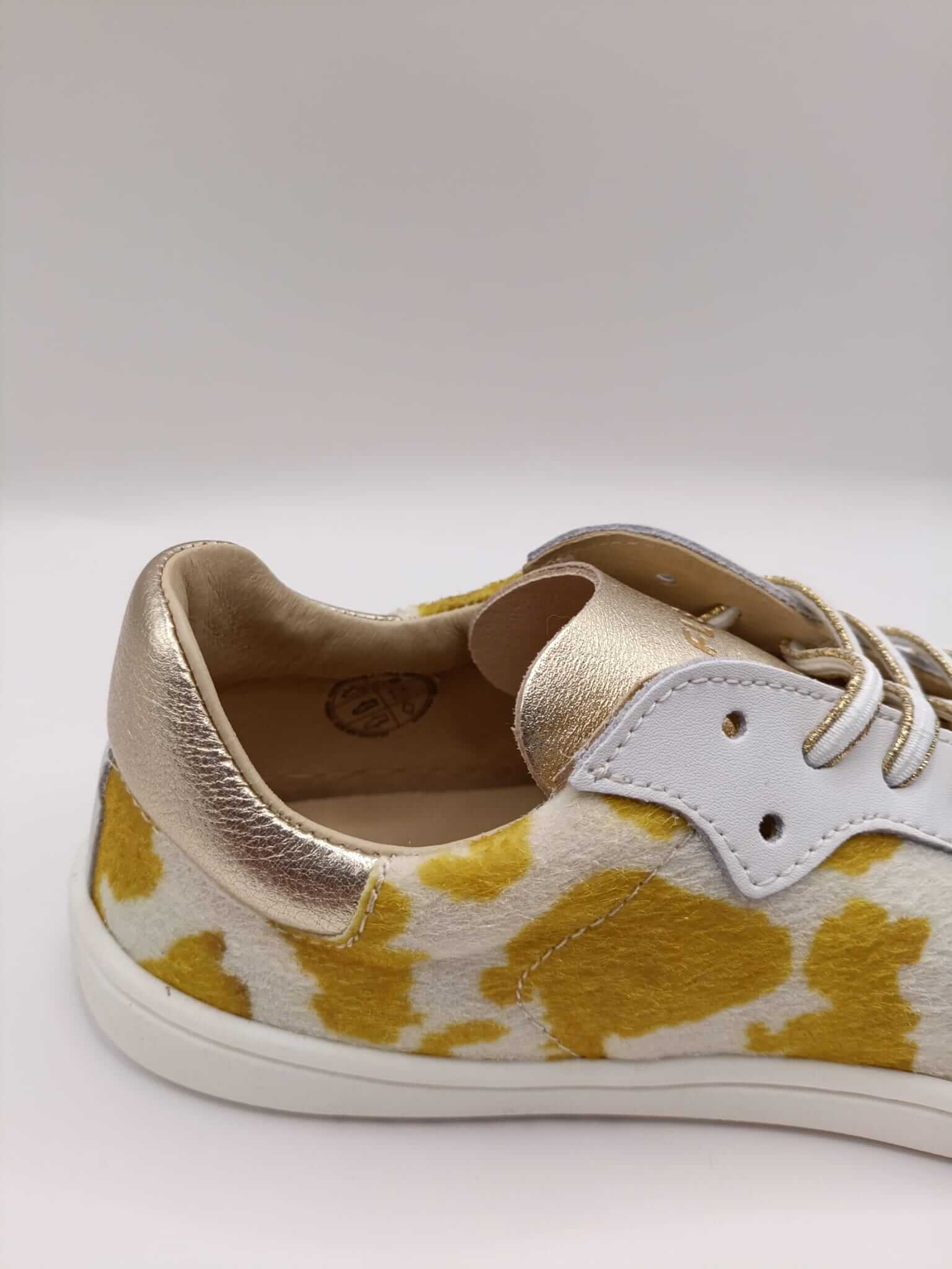 Zapatillas barefoot mujer horma XL fabricadas en piel suave con estampado vacuno y puntera metalizada. Diseñadas para pie ancho, con puntera amplia, zero drop y suela flexible cosida. Calzado minimalista respetuoso, fabricado en España. Tallas 37–42.
