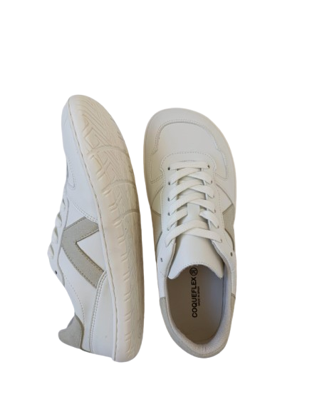 Zapatillas barefoot veganas unisex Coqueflex en blanco y beige. Tennis ligeros y respetuosos con suela flexible, puntera ancha y materiales veganos resistentes.